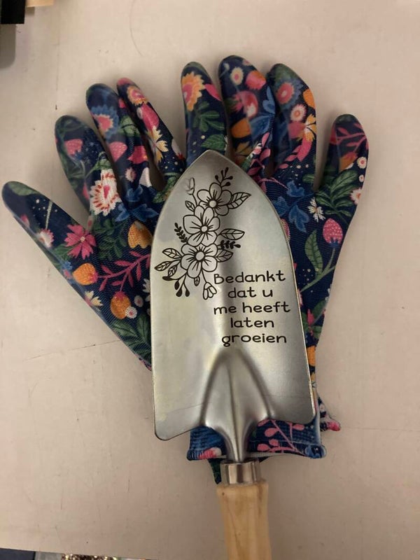 dit schepje komt met een gratis setje tuin handschoenen (kleur en/of opdruk worden willekeurig gekozen) zo heb je een leuk totaal pakketje.
